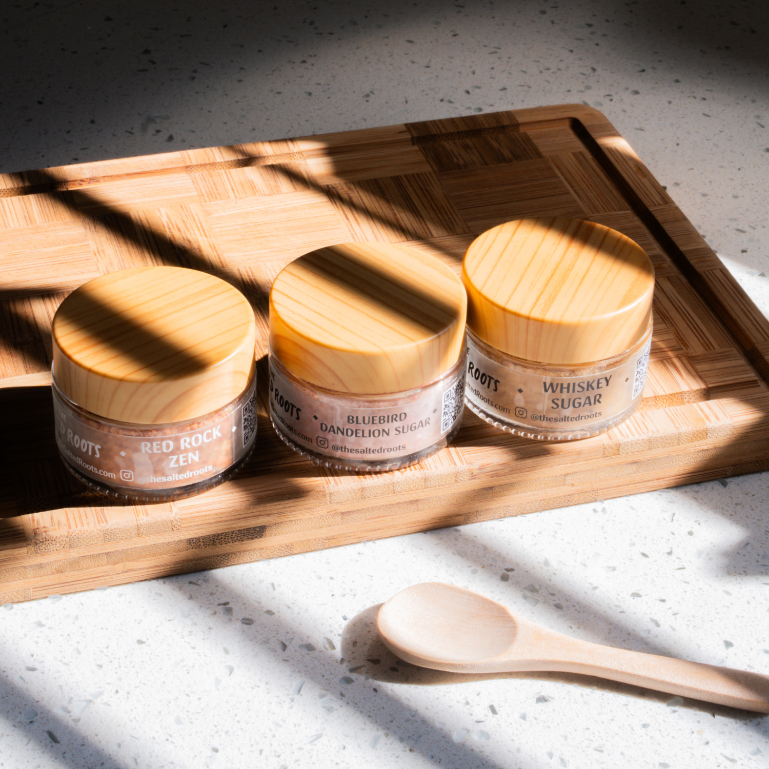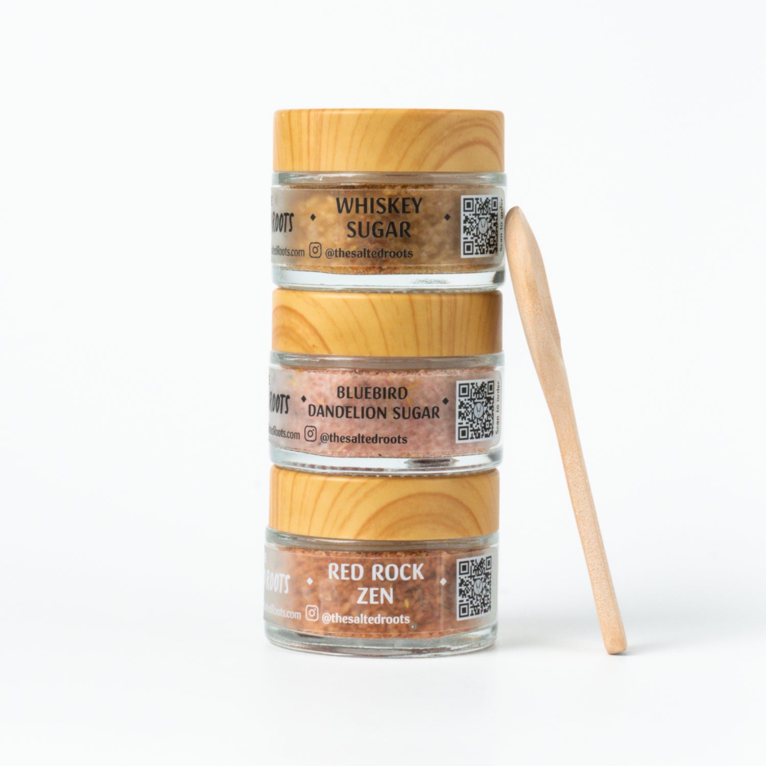 This trio offers a quiet calm to every day. Bluebird Dandelion Sugar brings a vanilla, floral kissed sweetness to tea, lemonade, scones, muffins, and homemade jam. Whiskey Sugar adds silky, caramel warmth to crème brûlée, cookies, and berries, while Red Rock Zen layers umami richness into stir fries and pho.